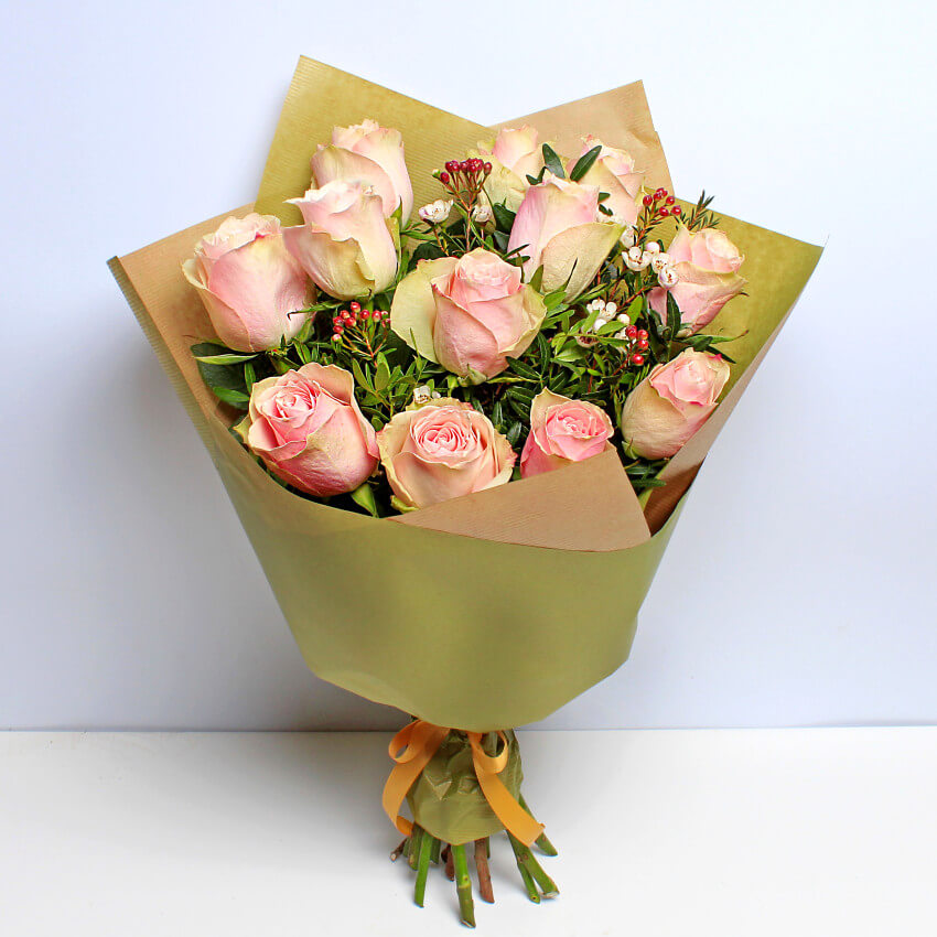 Our local florists offer this stunning hand tied bouquet of a dozen pink roses to show you love all through the year. These beautiful blooms are available for next day delivery and are a perfect gift any time of year.