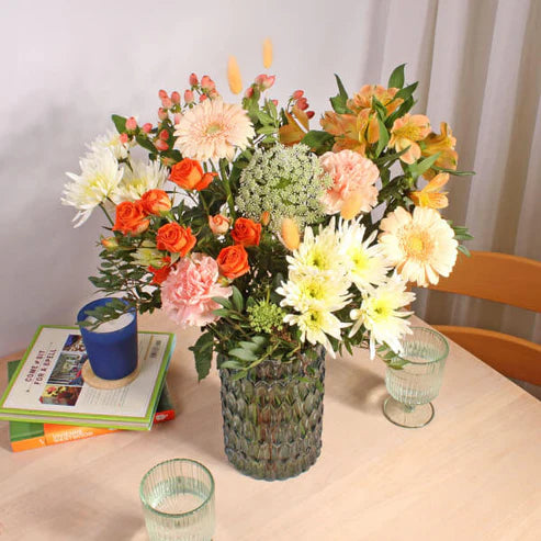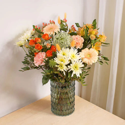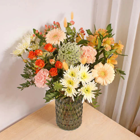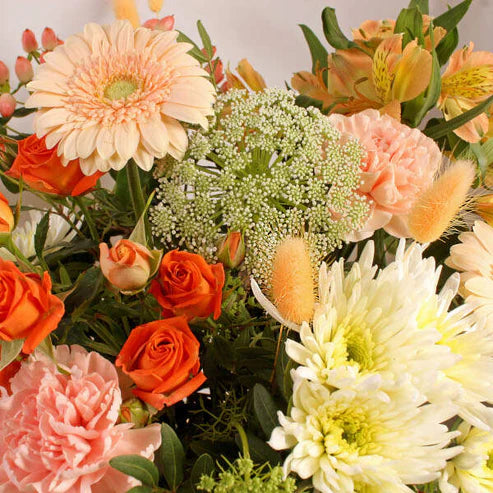 A peach dream come to life! This arrangement of peach germinis, bunny grass, carnations, alstromerias and hypericums create a bountiful bouquet. You'll feel like you're in a peach paradise! Made by skilled florists and delivered with joy and care.