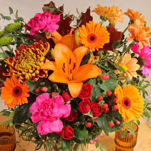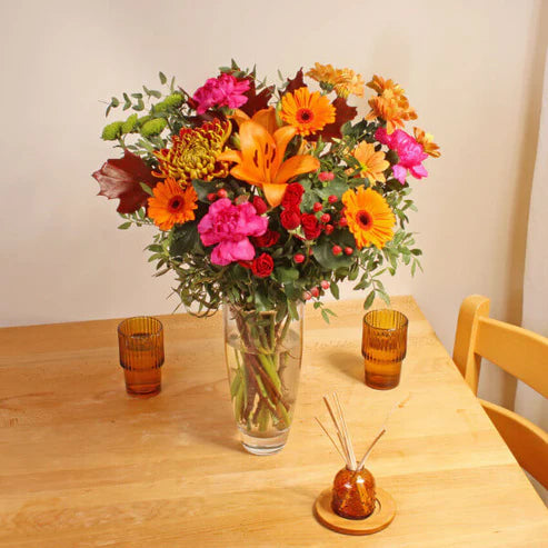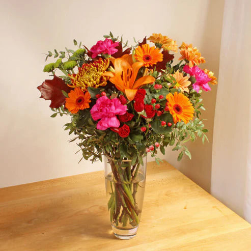 Autumn Splendour is a stunning and spectacular arrangement of seasonal flowers that makes the perfect gift for cosy evenings by the fire. These hand tied flowers are expertly crafted by a local florist for maximum freshness.