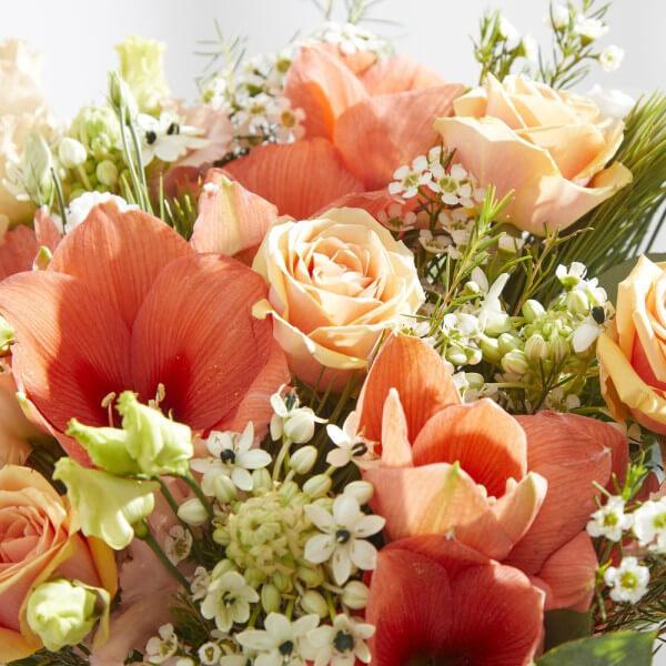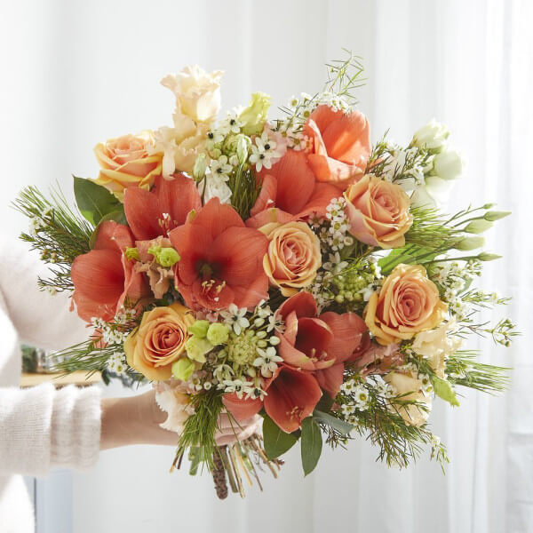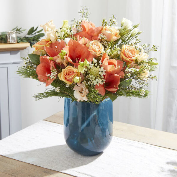Arranged by hand, this exquisite bouquet features festive peachy blooms that spread warmth and love. Feel refreshed with its mild fragrance and stunning arrangement of flowers. These will be prepped and packed securely, shipped over night with our partner courier. We cannot deliver this item to Northern Ireland, Isle of Wight, Isle of Man, Channel Islands, Highlands of Scotland and Aberdeen, Jersey, Guernsey, Scilly Isles, Argyll, Shetland.