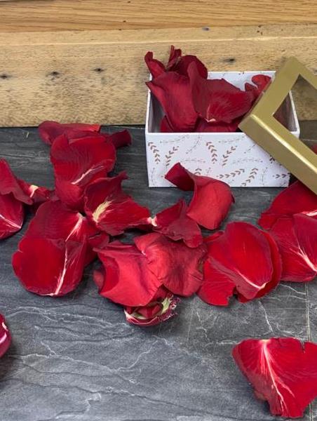 Add a romantic touch to Valentines with a gold box full of fresh Rose petals.