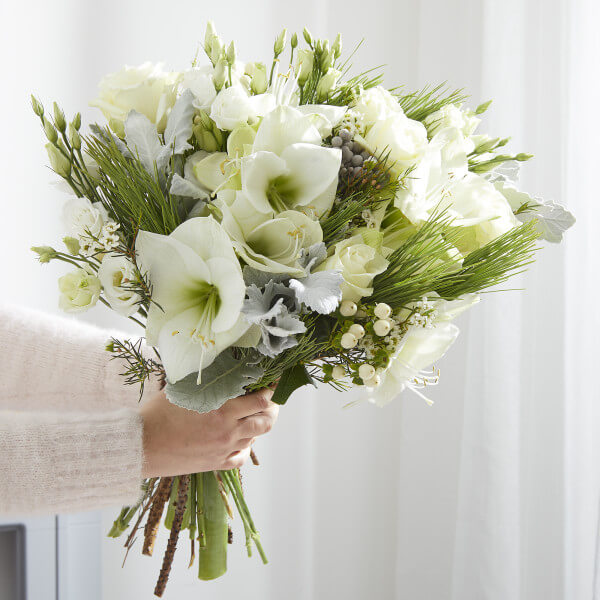This monochromatic bouquet of white blooms is a shining example of winter elegance. Set against gorgeous green senecio foliage and kiefer pine, finished with festive flourishes of brunia. These will be prepped and packed securely, shipped over night with our partner courier. We cannot deliver this item to Northern Ireland, Isle of Wight, Isle of Man, Channel Islands, Highlands of Scotland and Aberdeen, Jersey, Guernsey, Scilly Isles, Argyll, Shetland.