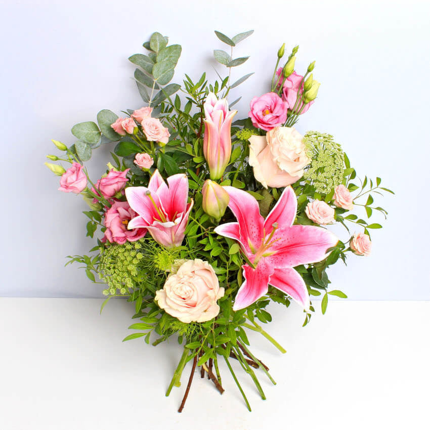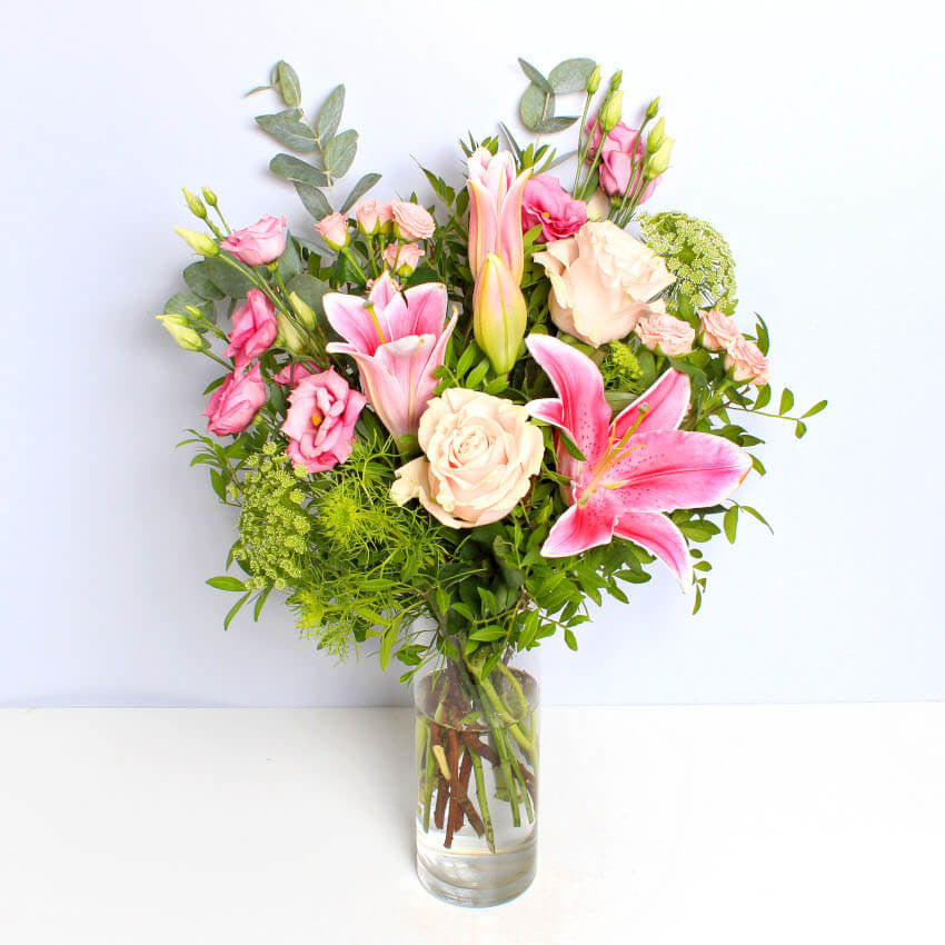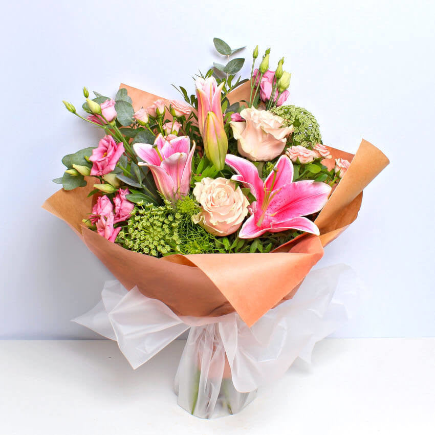 Surprise someone with this elegant display of pink lilies and roses. This beautiful Darcy bouquet is the perfect gift for birthdays or just because you want to surprise a loved oine with something unique and beautiful.
