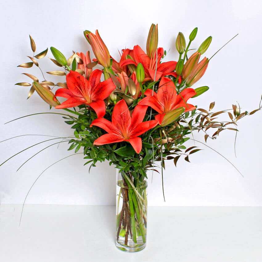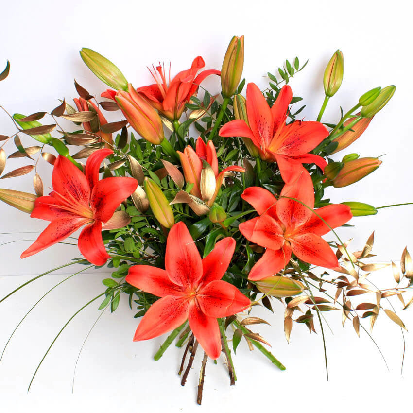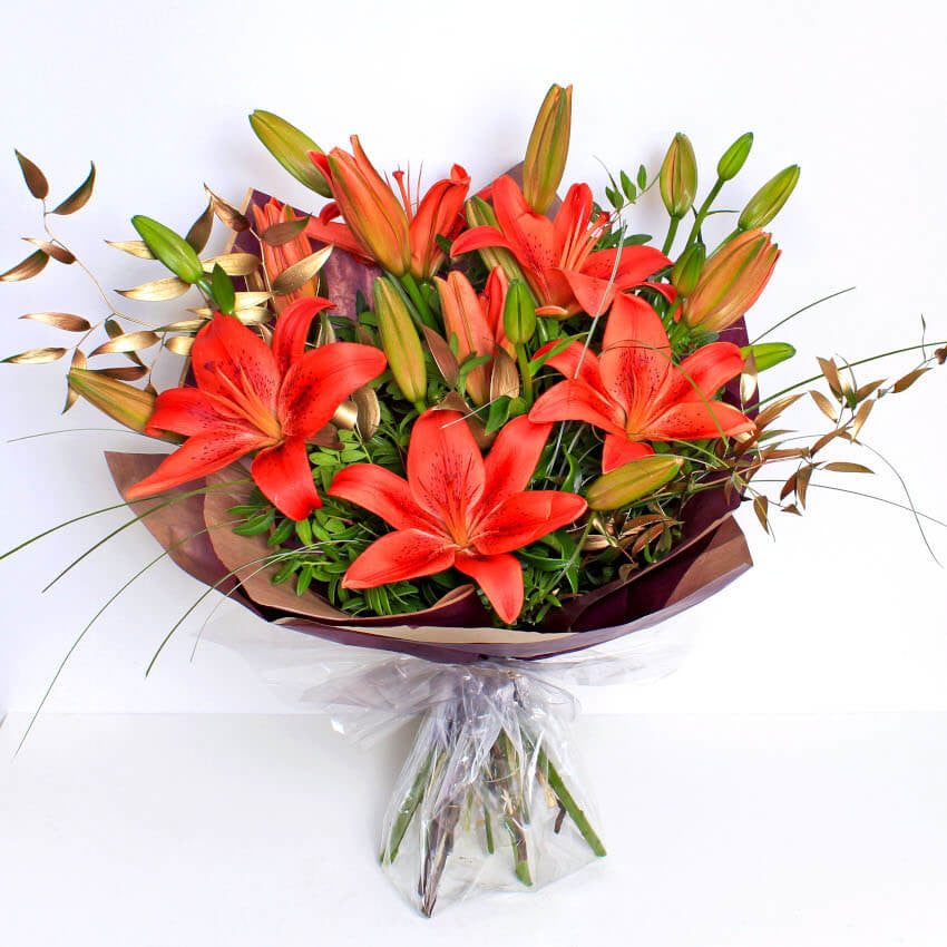 Festive Red Lilies are a great alternative to traditional Christmas flowers. The simple and elegant design is expertly arranged with hand tied flowers and tinted winter foliage by our local florists.