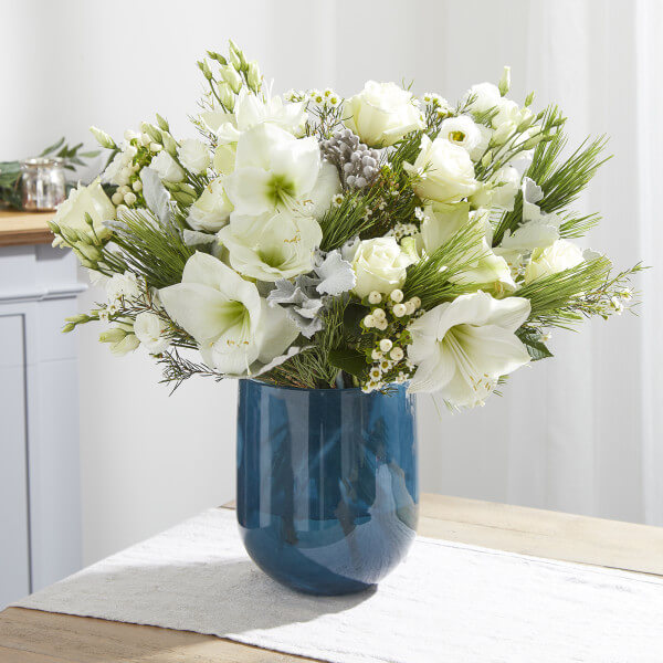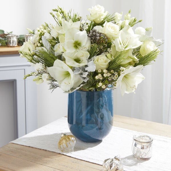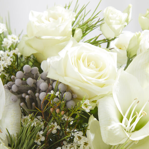 This monochromatic bouquet of white blooms is a shining example of winter elegance. Set against gorgeous green senecio foliage and kiefer pine, finished with festive flourishes of brunia. This makes a gorgeous gift for someone effortlessly chic. These will be prepped and packed securely, shipped over night with our partner courier. We cannot deliver this item to Northern Ireland, Isle of Wight, Isle of Man, Channel Islands, Highlands of Scotland and Aberdeen, Jersey, Guernsey, Scilly Isles, Argyll, Shetland.