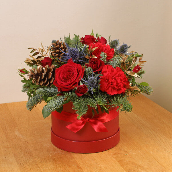 The Ho Ho Ho Hatbox is a beautiful floral arrangement making it the perfect centre piece this Christmas. This stunning design is handcrafted and features luxurious red roses, pine cones, scented cinnamon and winter greens.