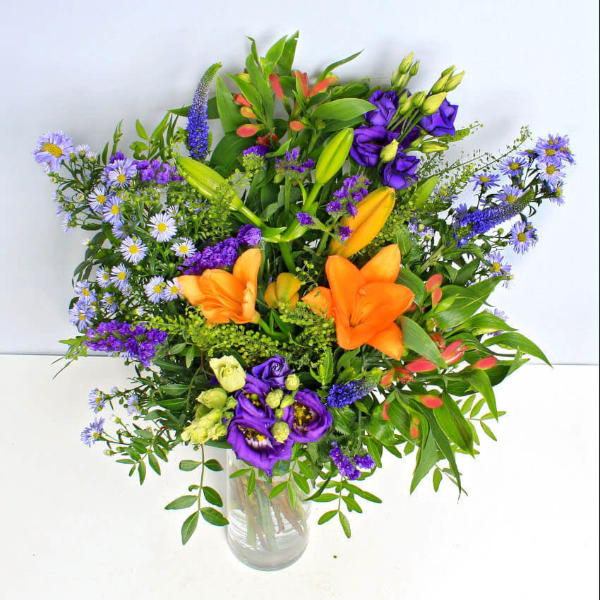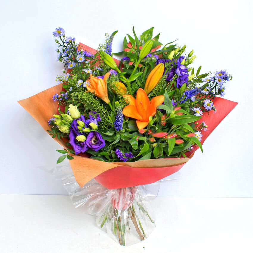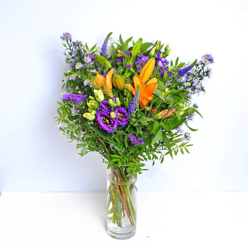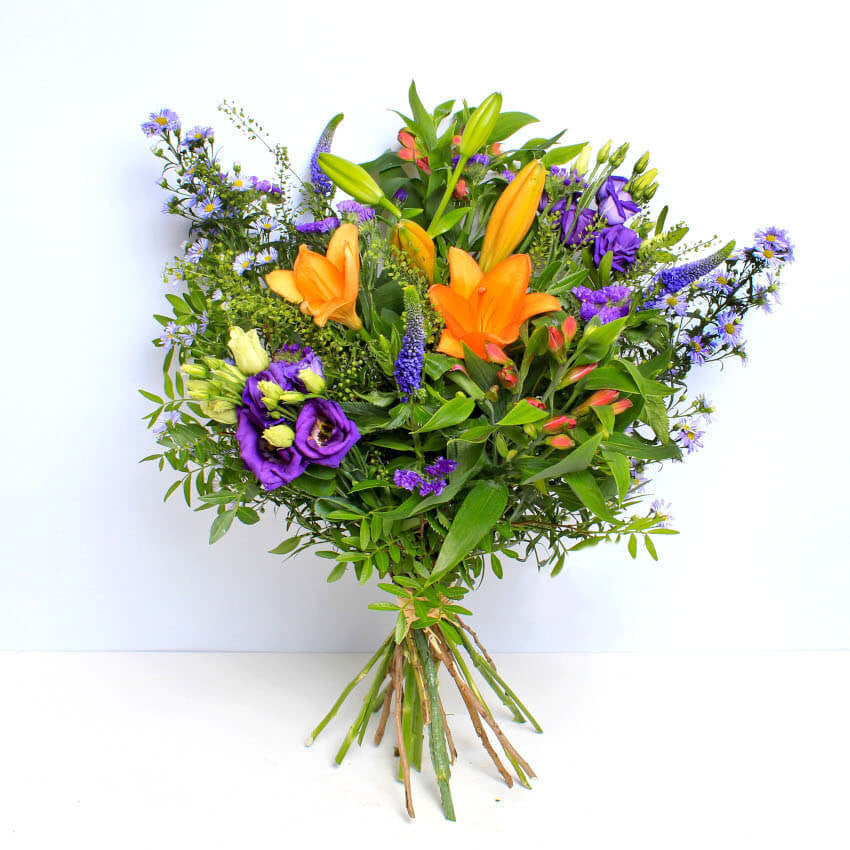 Each Jewel bouquet feqature fresh, hand tied flowers in vibrant purple. The combination of Alsotromeria and Veronica creates a wonderful aroma in addition to their eye catching apperance and are the perfect gift for all occassions.