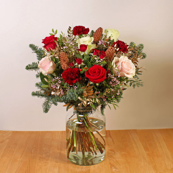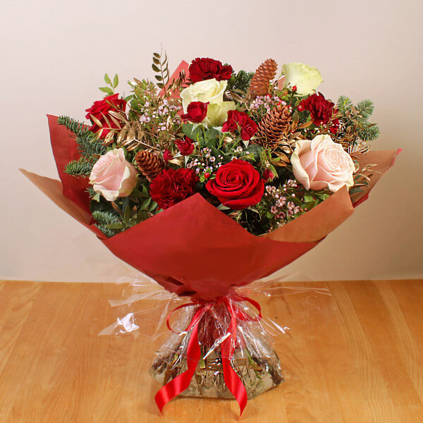 Our Luxe Christmas Handtied Bouquet is the ideal choice if you want to send Christmas flowers. A hand crafted combination of Carnations and Roses in festive colours with winter foliage and dried lotus pods.