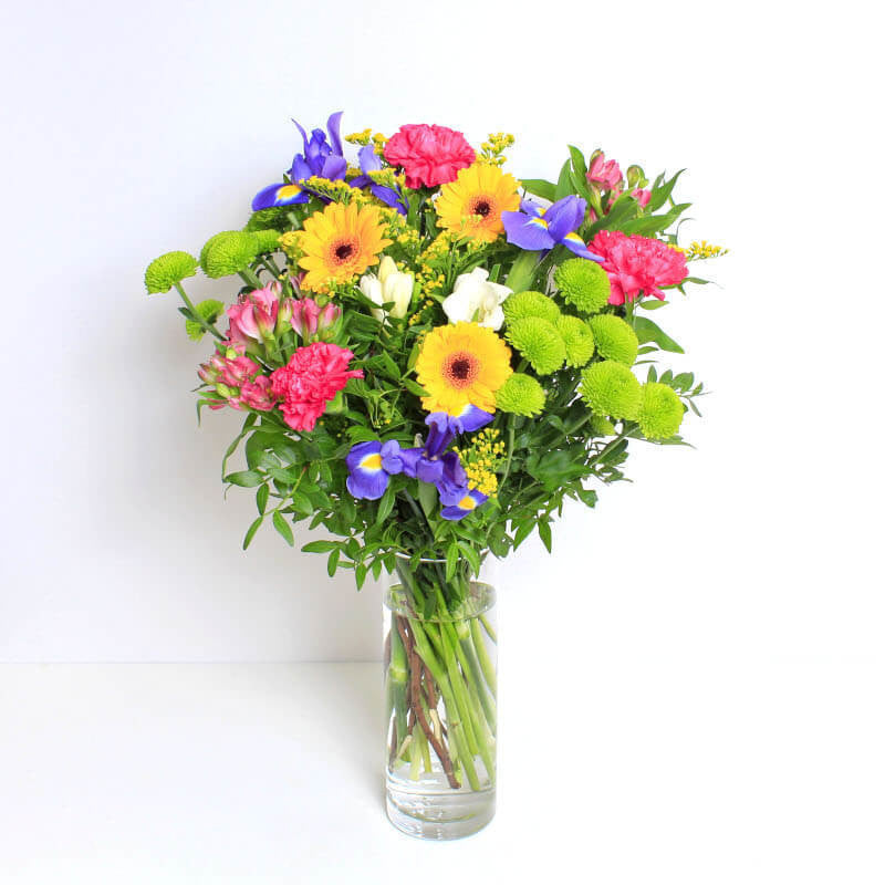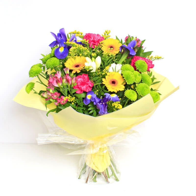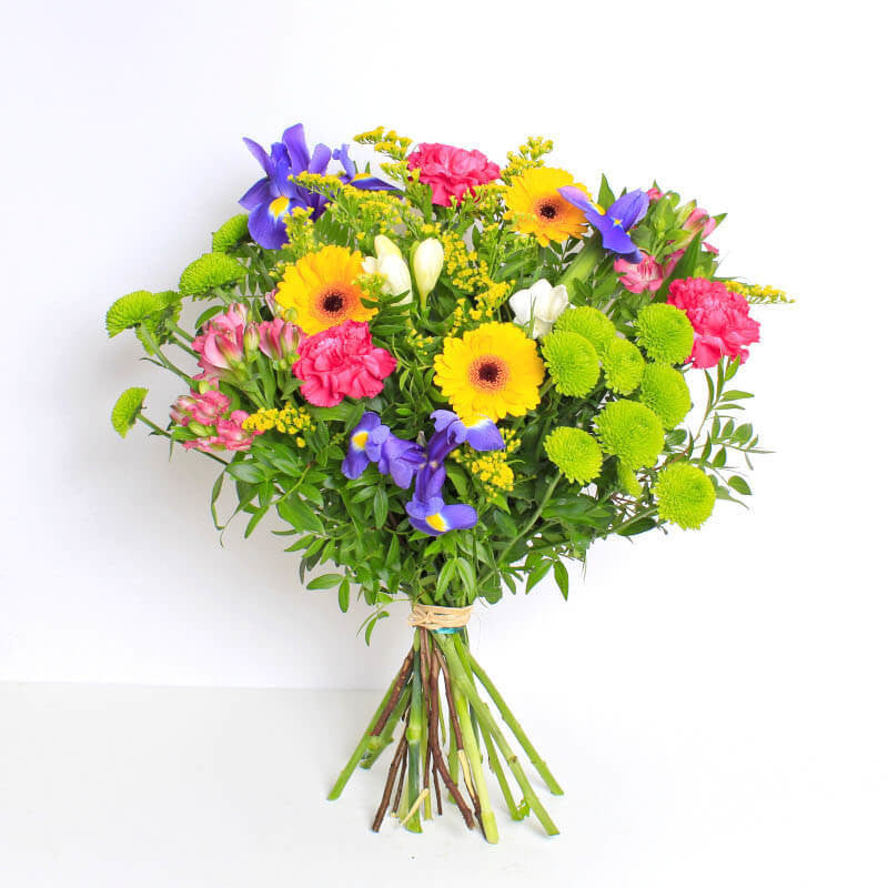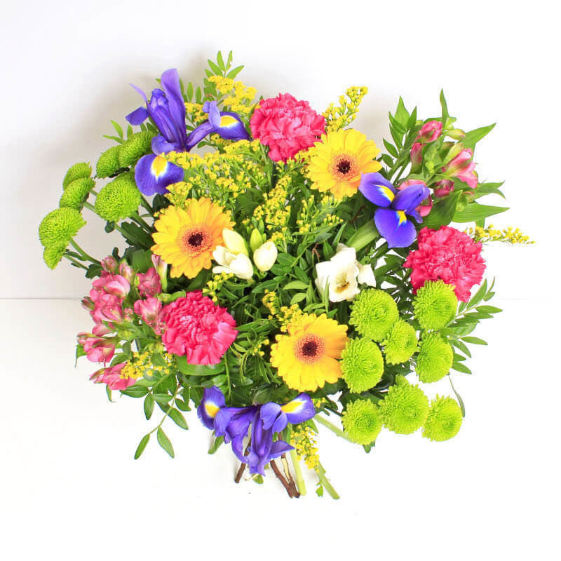A pleasing and vibrant bouquet featuring a combination of Germini, Iris and Carnation handcrafted using fresh, hand tied flowers, and the perfect gift for any occassion.