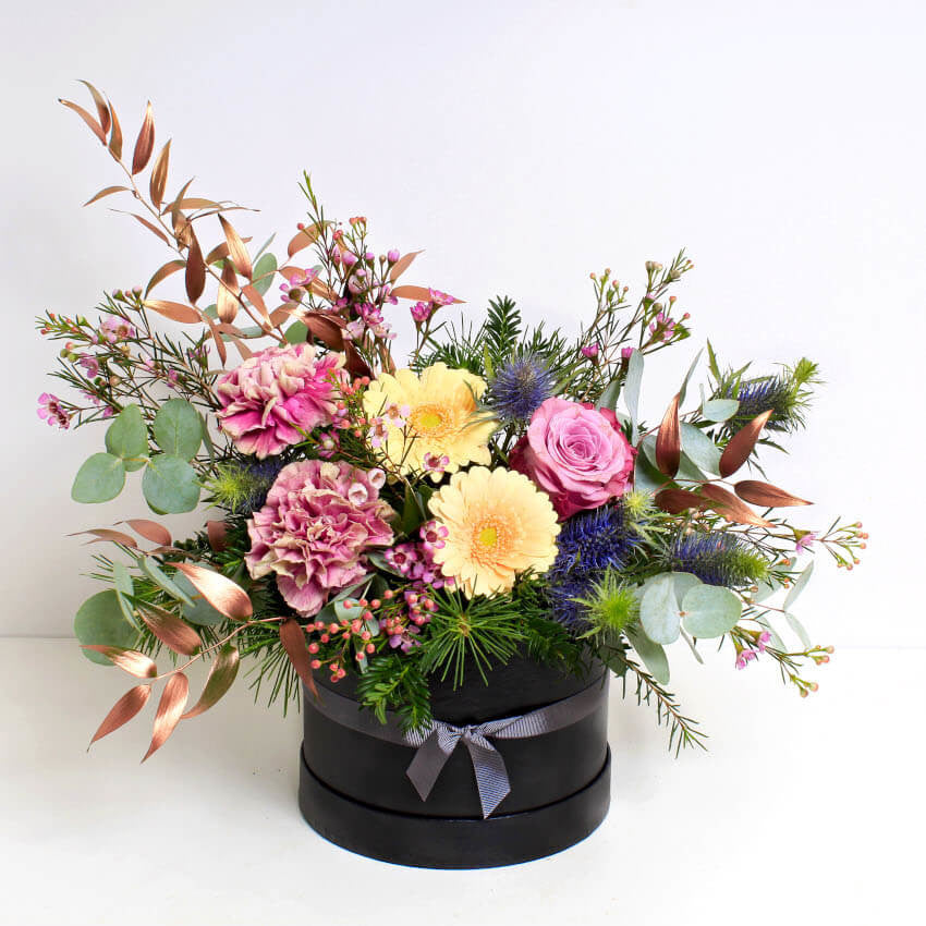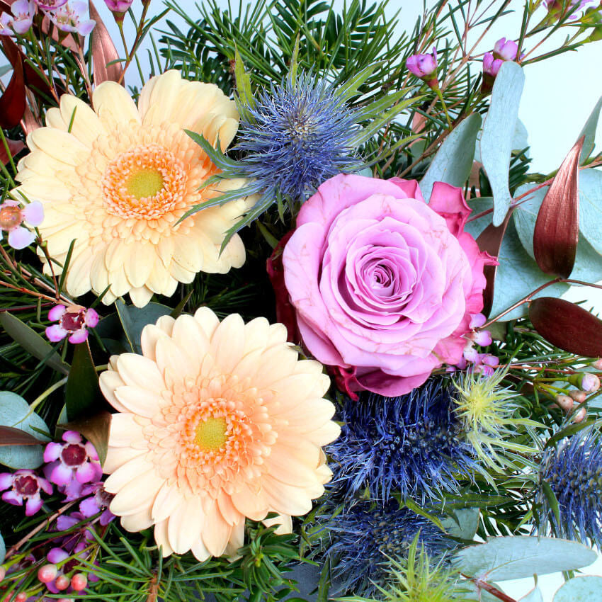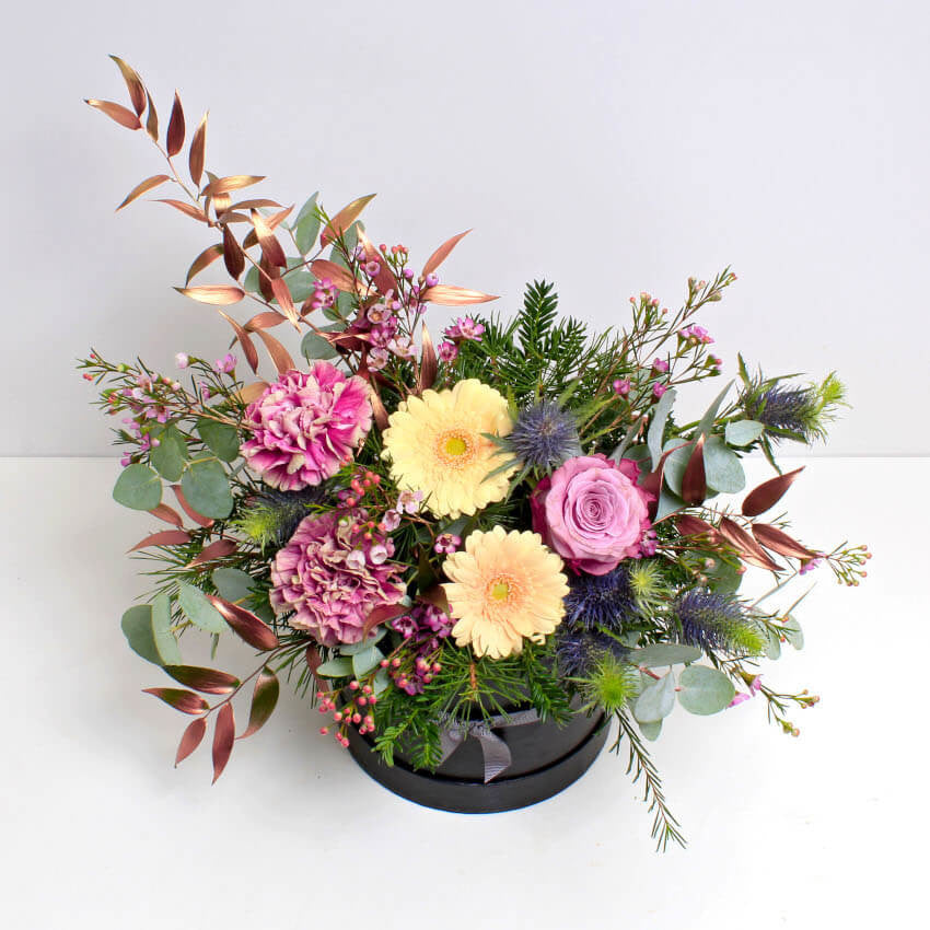 This delightful, handcrafted bouquet of seasonal flowers features Germini, Carnation and Roses and is the perfect gift for Christmas. Our flowers are ethically sourced and sustainable for a guilt free festive season.