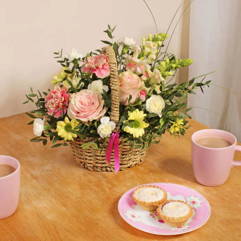A gorgeous Mother's Day flower basket packed with pink carnations and roses, lemon spray chrysanthemum and white spray carnations. A delectable arrangement, lovingly created by your local artisan florist and perfectly presented.