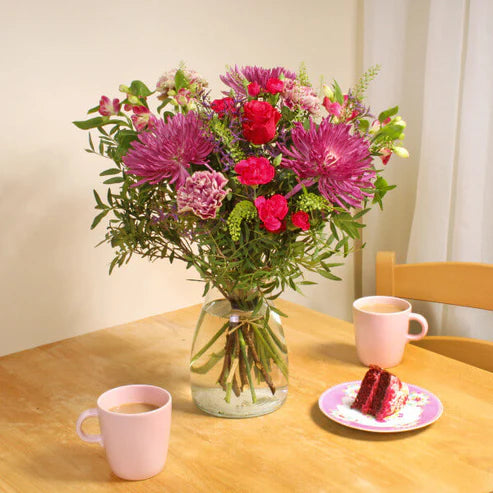 Bring the beauty of Plum Handtied to your doorstep. A delicate and feminine bouquet of purple and pink carnations and chrysanthemums. A gift that is sure to make someone's day a little sweeter.