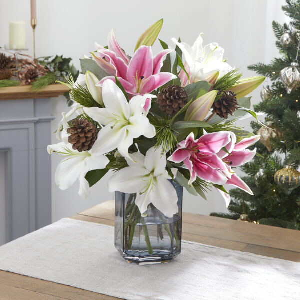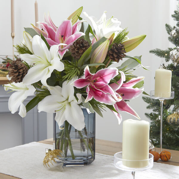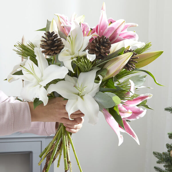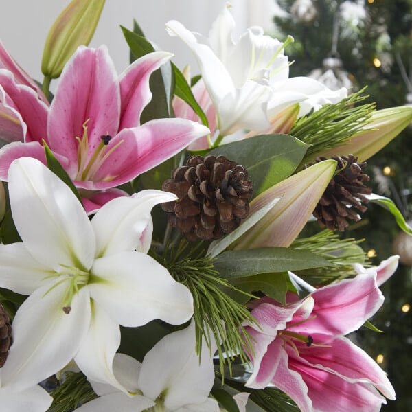 Lily-lovers rejoice! White and pink lilies made festive, this bouquet highlights the beauty of these classic blooms. A full blown, vibrant bouquet of hand cut flowers, available for next day delivery within the UK. These will be prepped and packed securely, shipped over night with our partner courier. We cannot deliver this item to Northern Ireland, Isle of Wight, Isle of Man, Channel Islands, Highlands of Scotland and Aberdeen, Jersey, Guernsey, Scilly Isles, Argyll, Shetland.