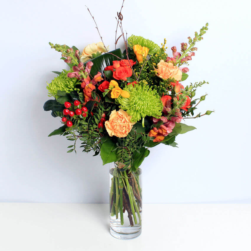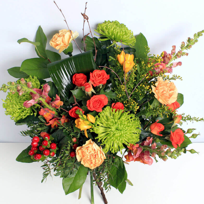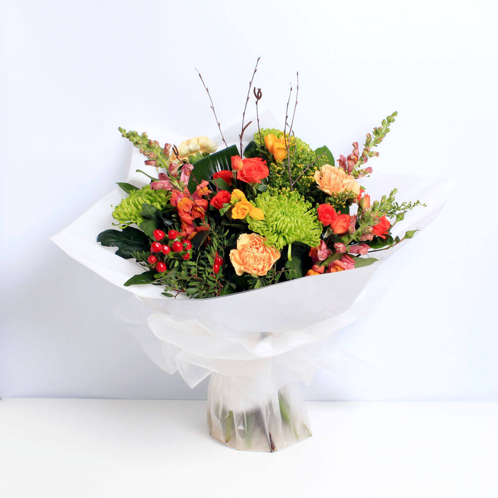 A delightful combination of Autumn colours is the highlight of this bouquet of seasonal flowers featuring Antirhinum. Handcrafted by local florists from the finest ethically sourced, sustainable flowers.