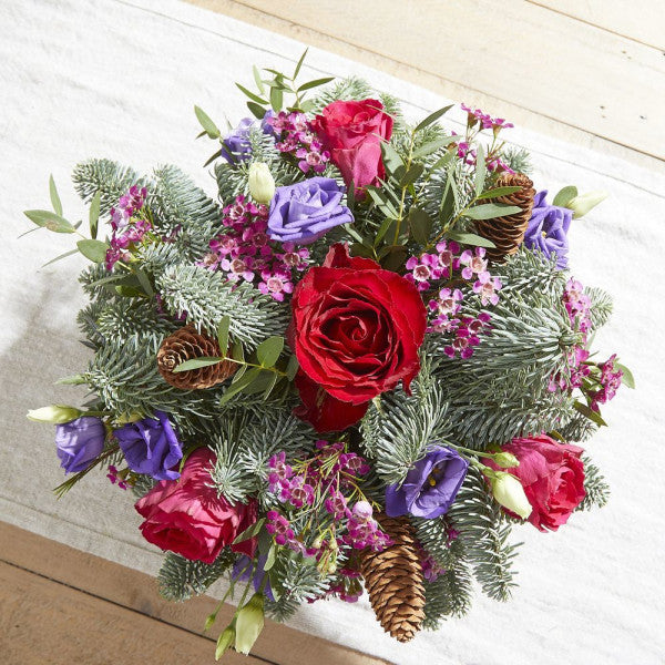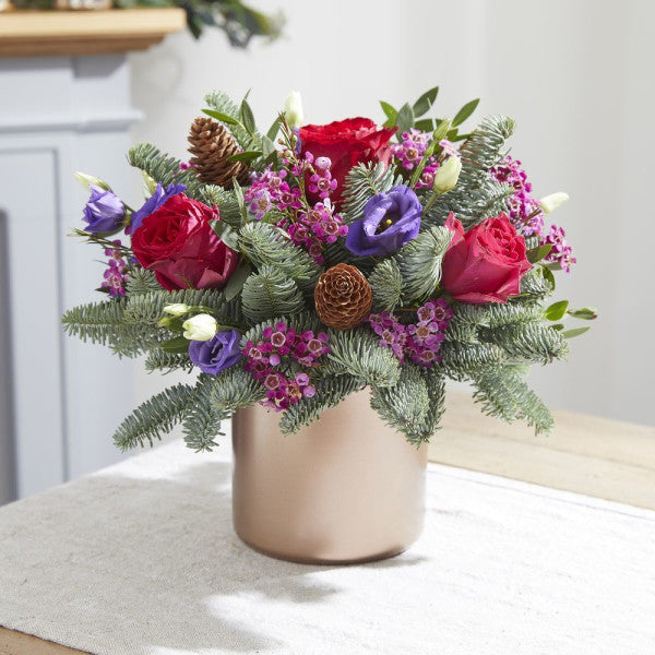 FESTIVE TABLE FLOURISH Whether you're entertaining guests, enjoying time with your family, or sharing a moment with someone special, this table arrangement helps set the scene. Filled with gorgeous rich colour and festive highlights like pine and spruce cones, it's the perfect winter centrepiece. IN THE BOX This beautiful Table arrangement is created using the following flowers, foliage and decoration: Roses, lisianthus, pink waxflower, parvifolia foliage, spruce cones,nobilis fir, metal bowl. These will be prepped and packed securely, shipped over night with our partner courier. We cannot deliver this item to Northern Ireland, Isle of Wight, Isle of Man, Channel Islands, Highlands of Scotland and Aberdeen, Jersey, Guernsey, Scilly Isles, Argyll, Shetland.