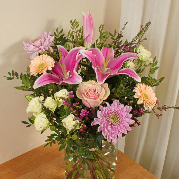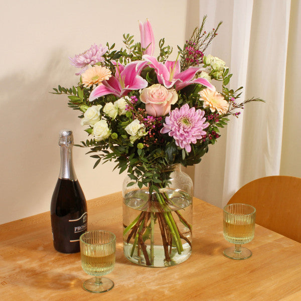 Germini, Lilies, and Roses make up the sweet-smelling The Remy bouquet, which is ideal for cheering someone up. This bouquet is skillfully made by our florist. Both next-day courier delivery and same-day hand delivery are available.