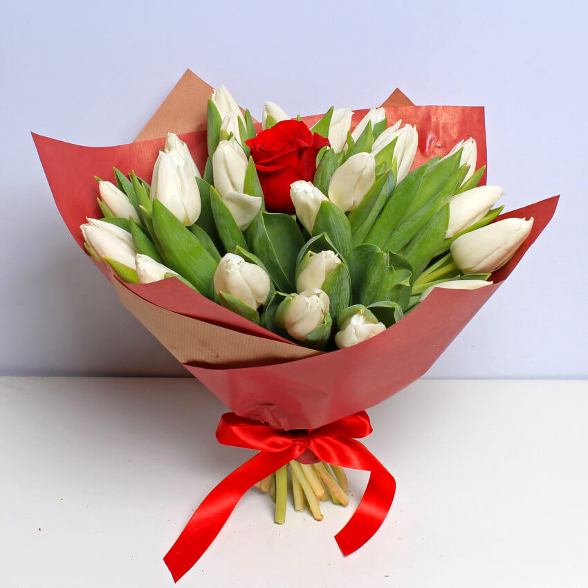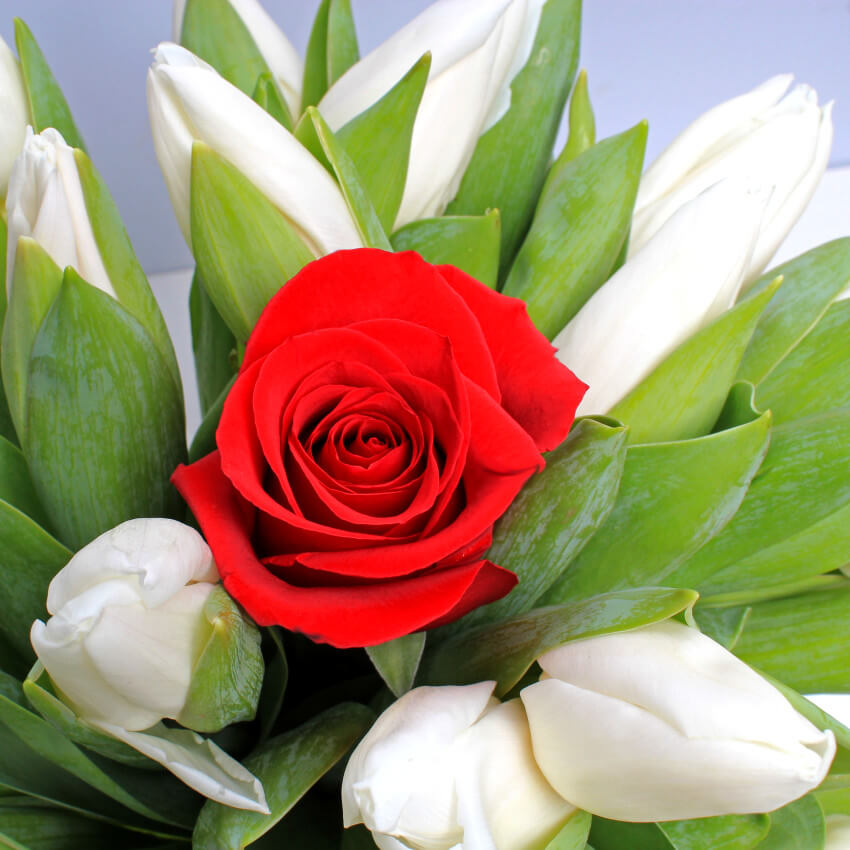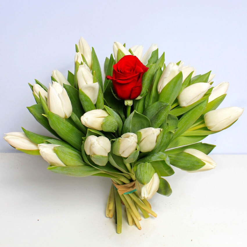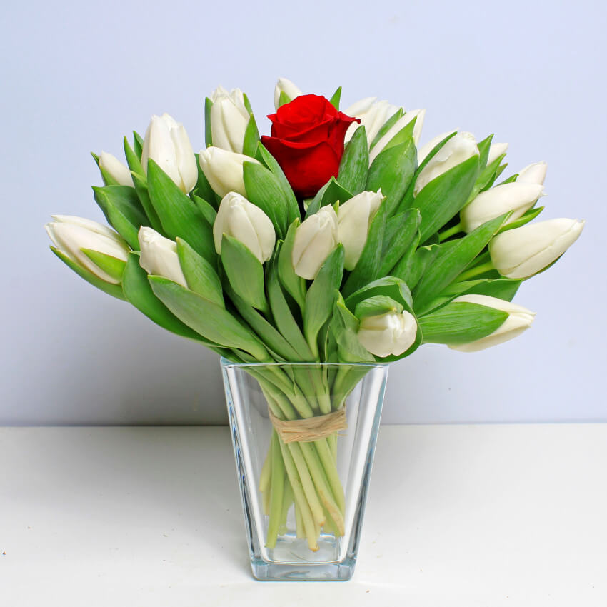 I think the name of this hand tied bouquet says it all. A simple, significant rose nestled amongst a bed of white tulips encompassed in a wild and lush green border. Understated. Classy. Beautiful. Sometimes less really is best. This bouquet will be handtied by an expert florist and shipped overnight in secure packaging