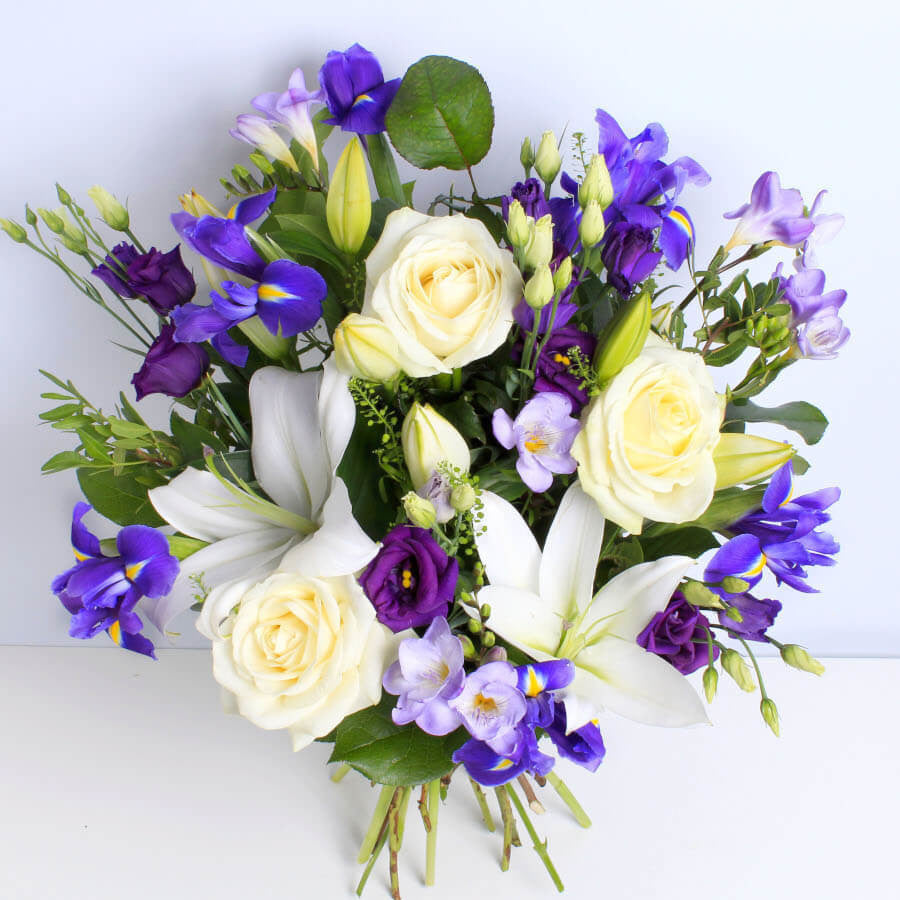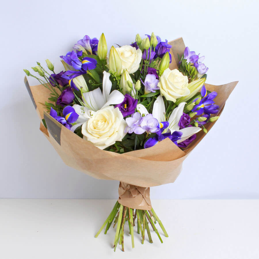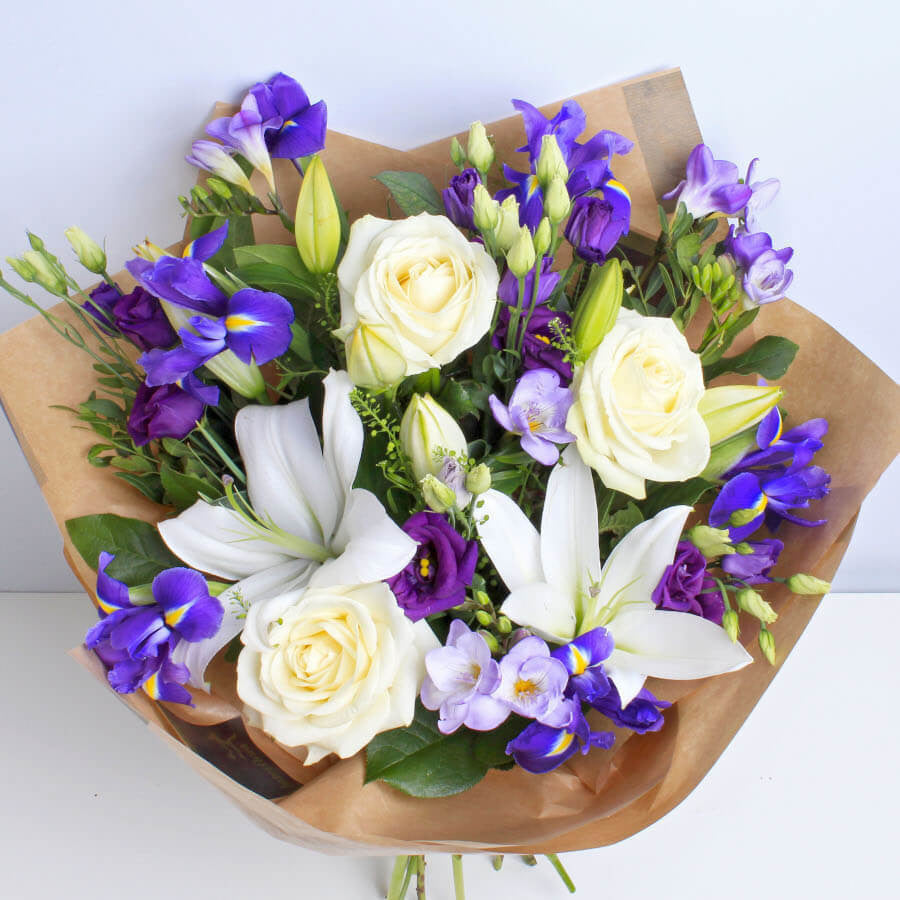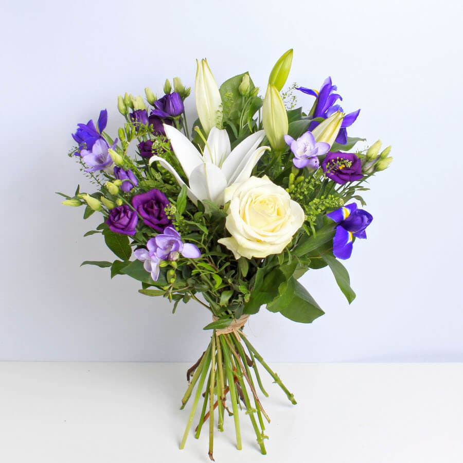 A wonderful gift for any occassion, this handcrafted bouquet of subtle white and purple blooms will provide delight and joy to all those who receive it.