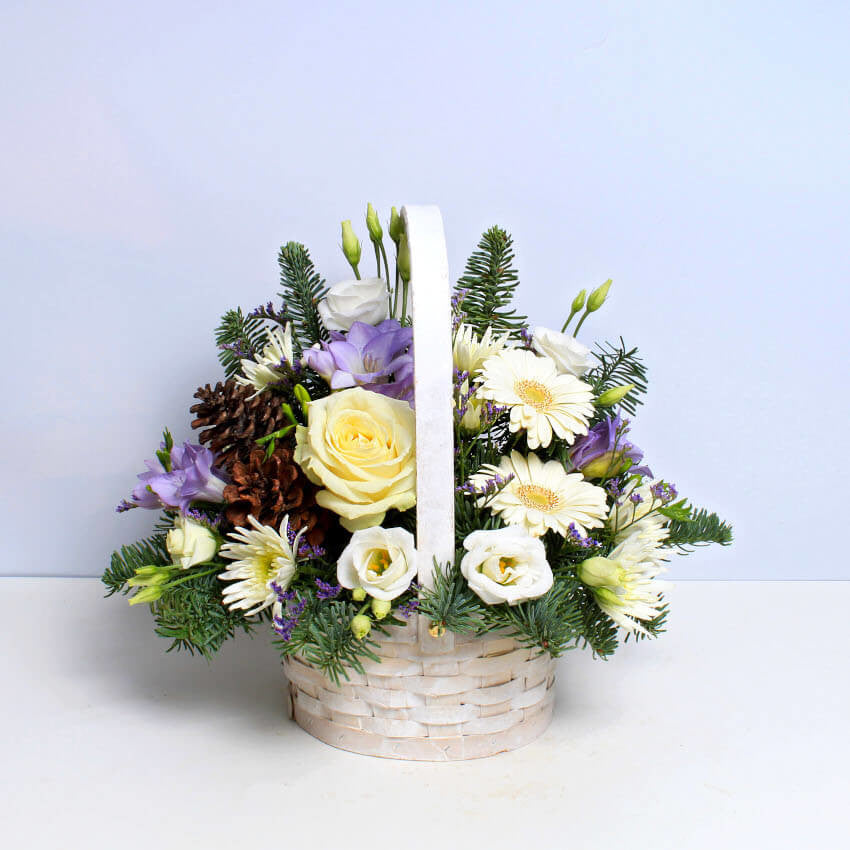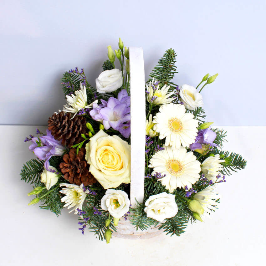 A wonderful combination of seasonal flowers, our Winter Frost Basket features Germini, Chrysanthemum, Freesia, Lisianthus and Roses in delicate pastel shades. Our ethically sourced, sustainable flowers are the perfect gift for Christmas Day.
