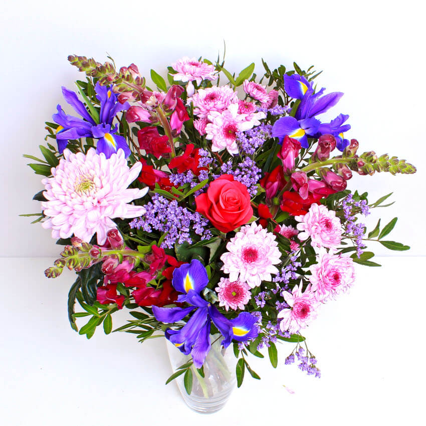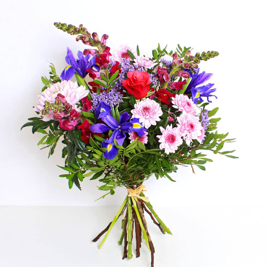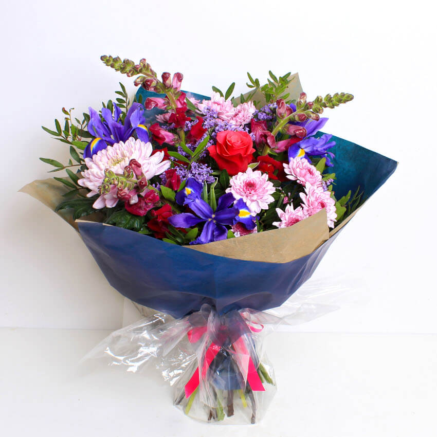 A creative, colourful combination of Antirhinum, Iris, Chrysanthemum and Roses this handcrafted bouquet is a magnificient way to express your feelings. This richly toned arrangement of ethically sourced, sustainable flowers will brighten any occassion.